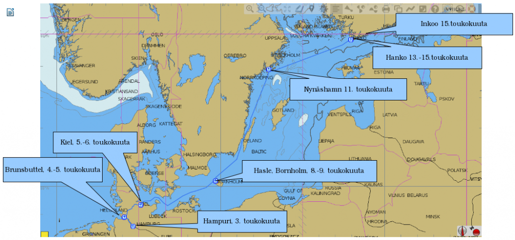 Markku: Pohjois-Itämeri Tuuliennusteet toteutuivat ja perjantaina keskipäivällä olimme keskellä Pohjois-Itämerta täydessä pläkässä. Kun aurinko paistoi ja tuntui jopa lämmittävän, pysäytettiin kone lounaan ajaksi ja nautittiin harvinaisesta näystä – rasvatyyni avomeri. Sitten koneella ajoa taas jatkettiin dialyysien kera. Vasta illalla tuuli voimistui sen verran, että voitiin siirtyä sen voimalla liikkumiseen. Eteneminen Hangon suuntaan oli aika hidasta, koska tuuli oli idästä. Laivaliikenne vilkastui taas, ja vaikka laivat varmaankin näkivät meidät tutkassa, tuntui AIS:n ilmoittama sivuutusetäisyys parin laivan kohdalla turhan pieneltä. Pimeässähän kaikki myös näyttää olevan lähempänä kuin onkaan.
